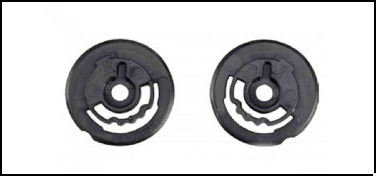Duas peças circulares pretas em plástico com orifício central