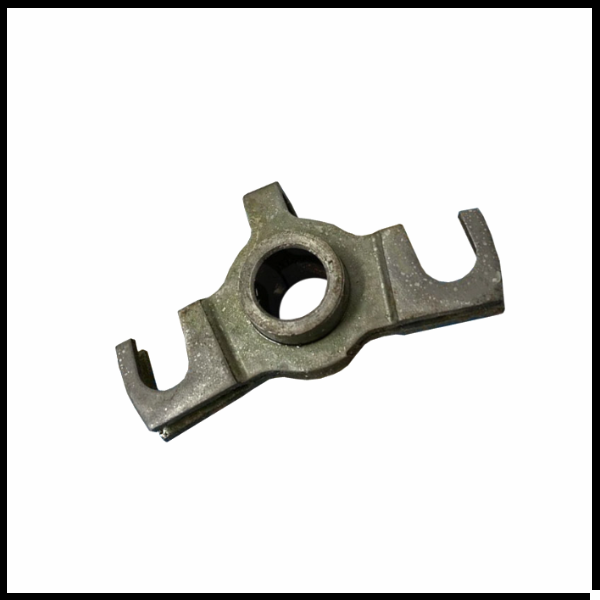 Peça metálica cinzenta com orifício central e ganchos nas extremidades