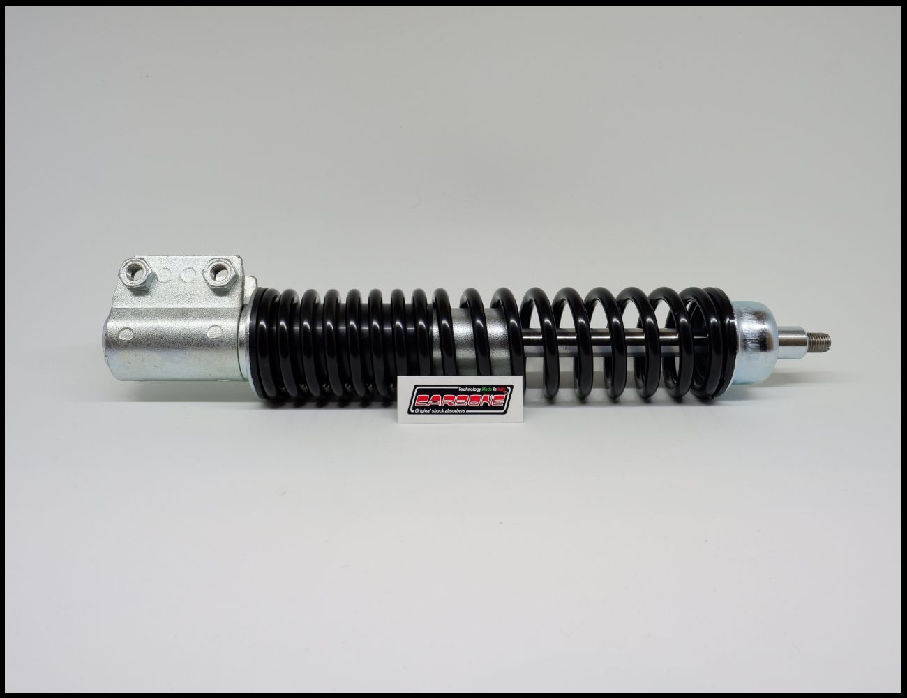 Amortecedor com mola preta e acabamento metálico prateado sobre superfície branca com etiqueta DANGER.
