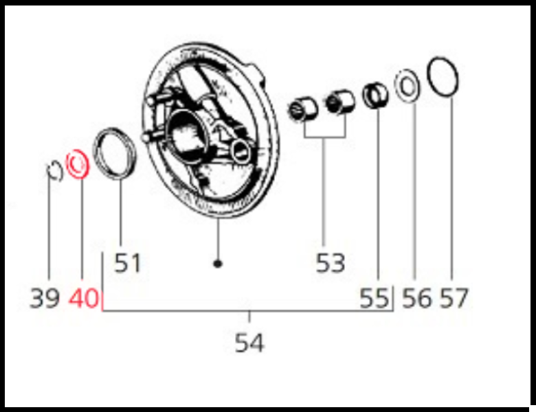 Desenho técnico de peças mecânicas circulares numeradas em fundo branco