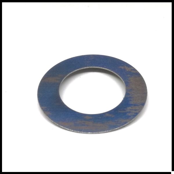 Arruela metálica azulada com manchas de desgaste sobre fundo branco