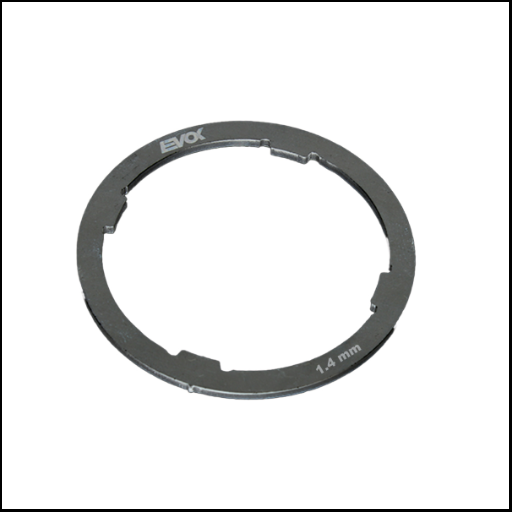 Anel metálico cinzento com inscrições EVOX e 1.4 mm