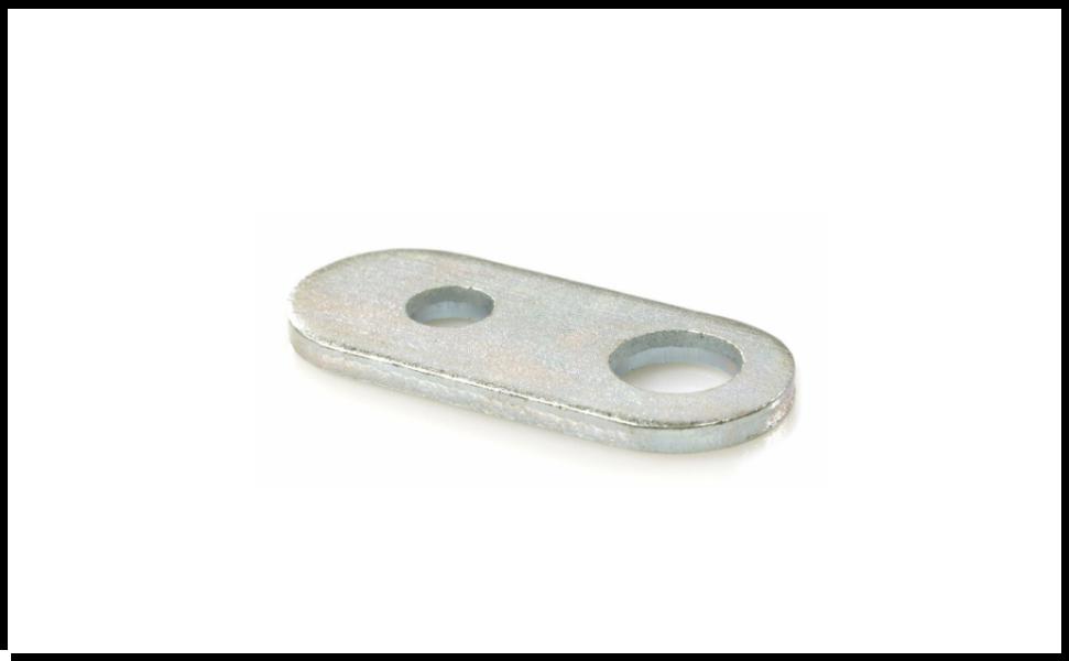 Peça metálica retangular prateada com dois furos circulares, fundo branco