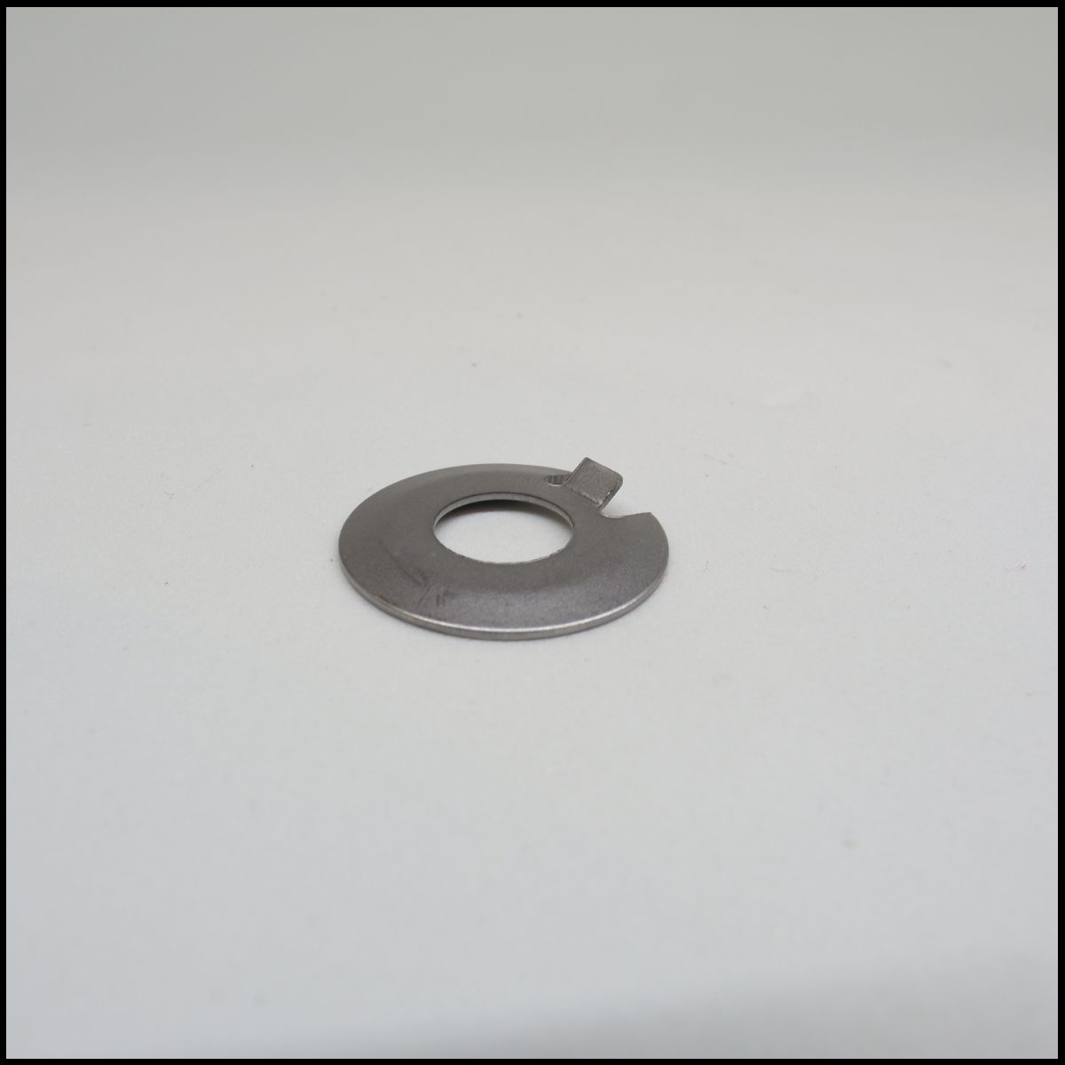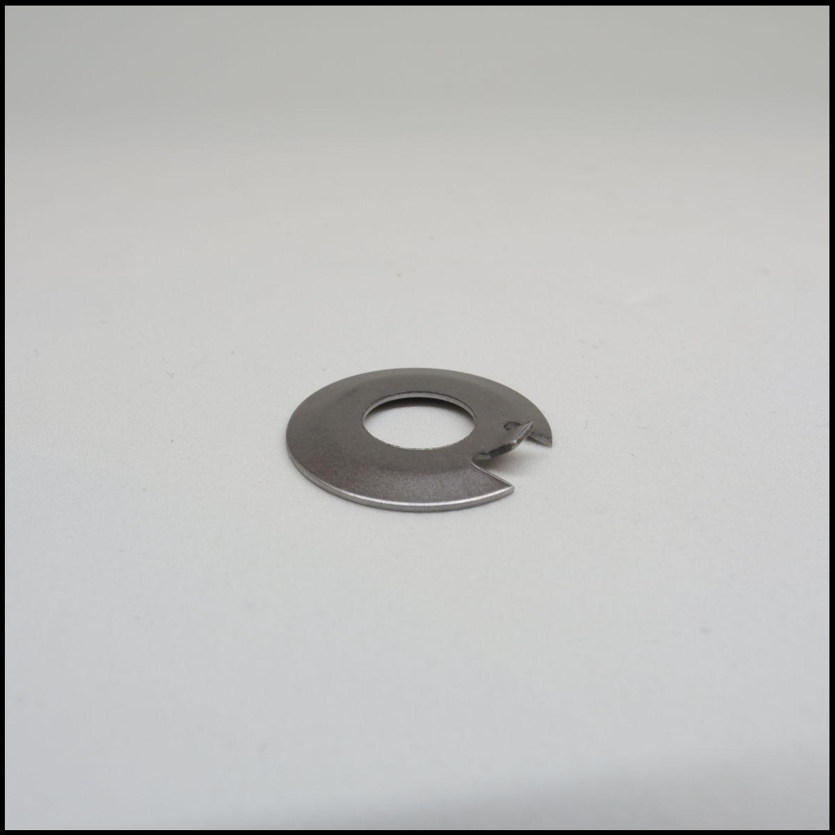 Arruela metálica prateada com fecho numa superfície branca