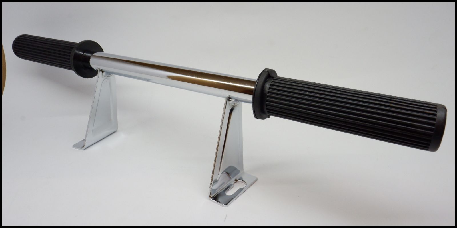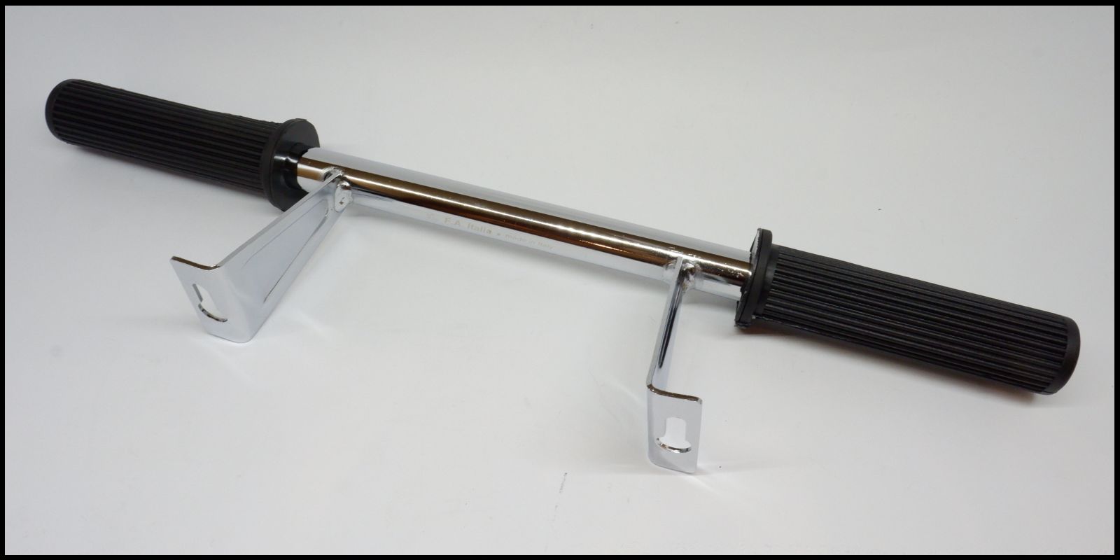 Barra metálica cromada com pegas pretas e suportes metálicos