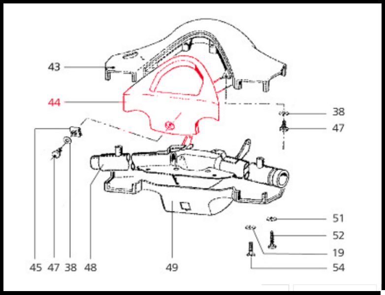 Diagrama técnico a preto e vermelho de várias peças numeradas