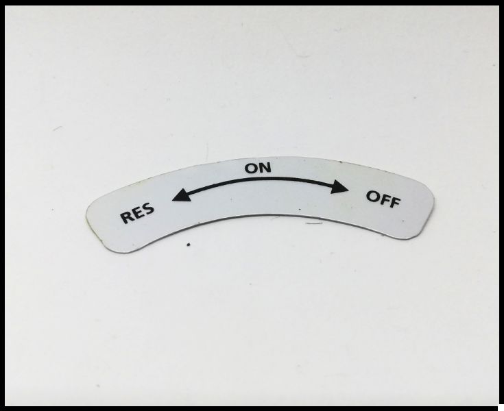 Etiqueta branca curva com texto preto RES ON OFF e setas de controlo.