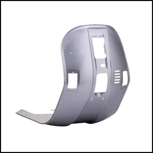 Peça metálica cinzenta curva com várias aberturas