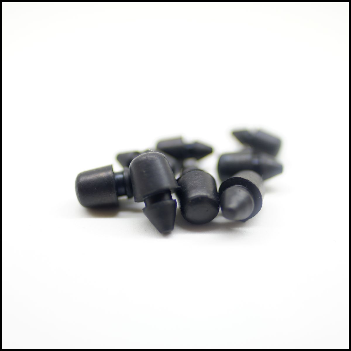 Pequenos tampões de borracha pretos sobre fundo branco