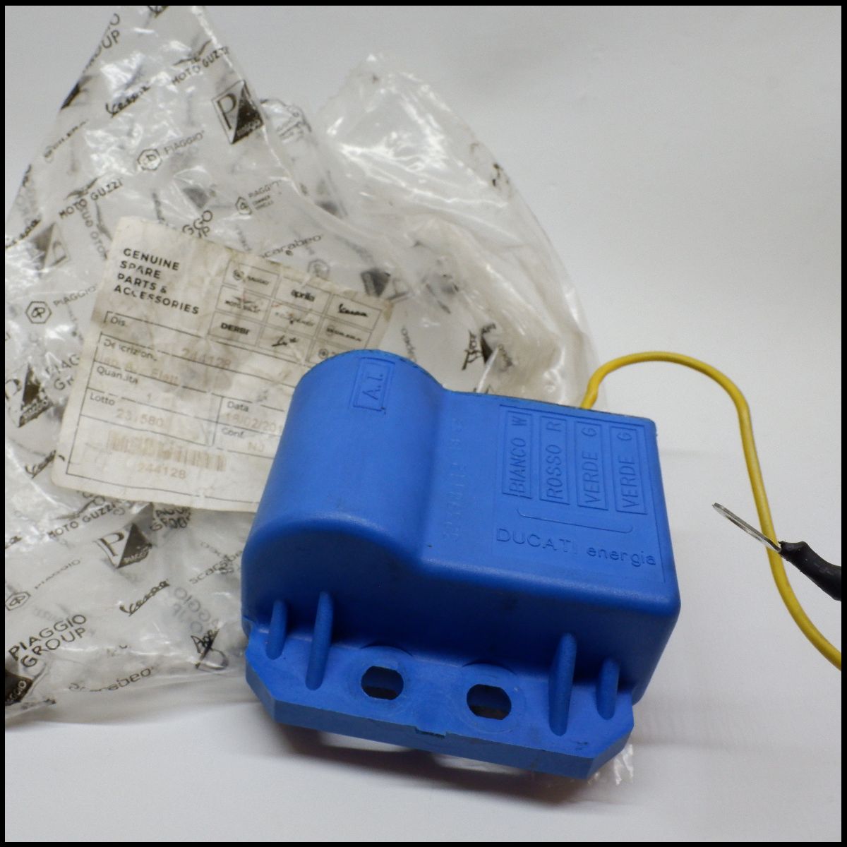 Componente elétrico azul Ducati Energia com cabo amarelo e embalagem Piaggio