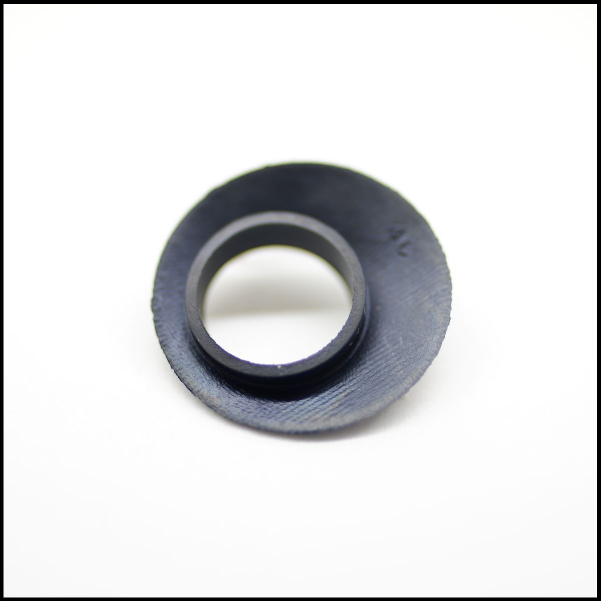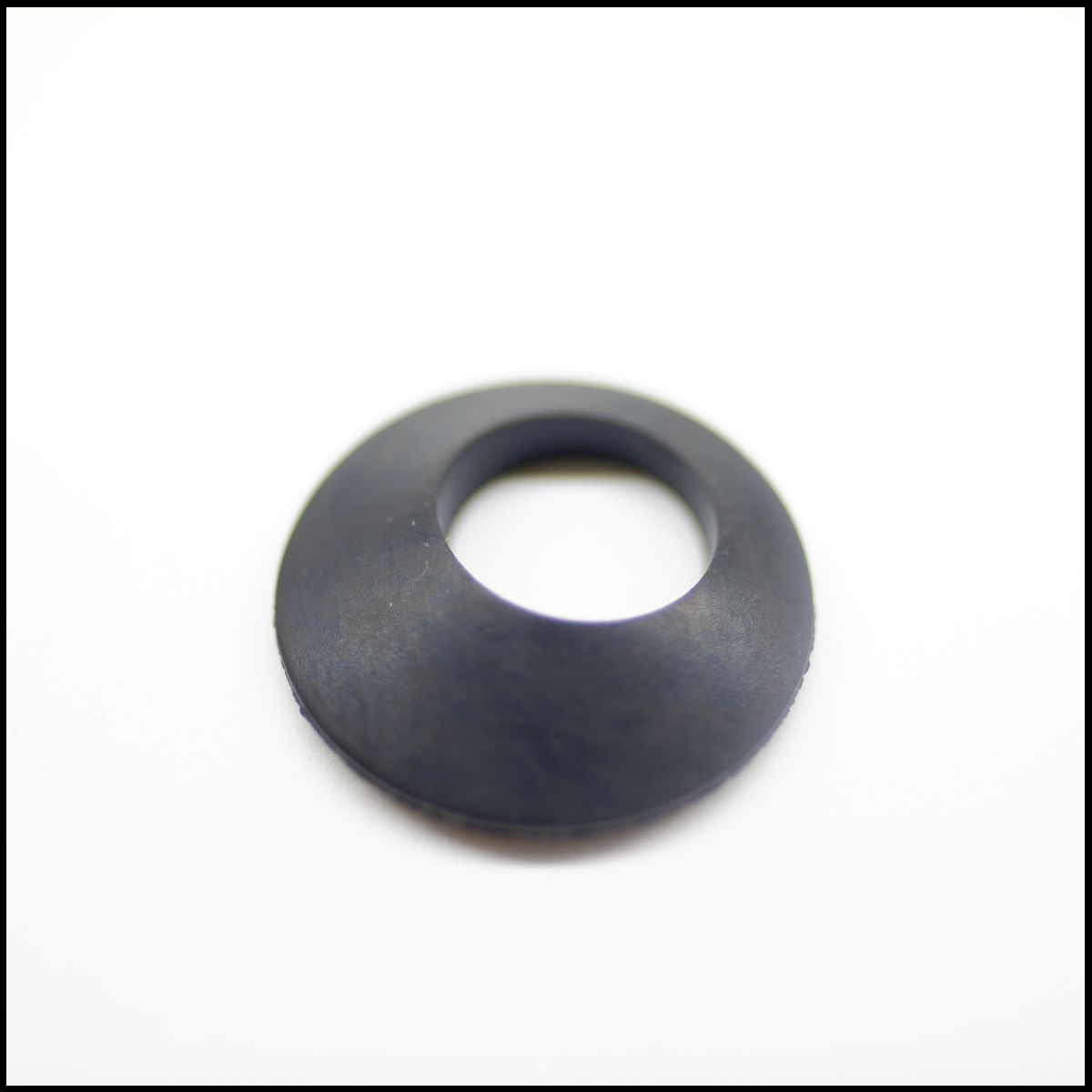 Peça circular em borracha preta com orifício central sobre fundo branco
