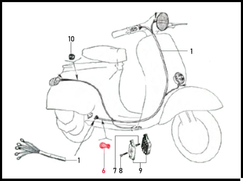 Desenho técnico de scooter com peças numeradas e cabo exposto