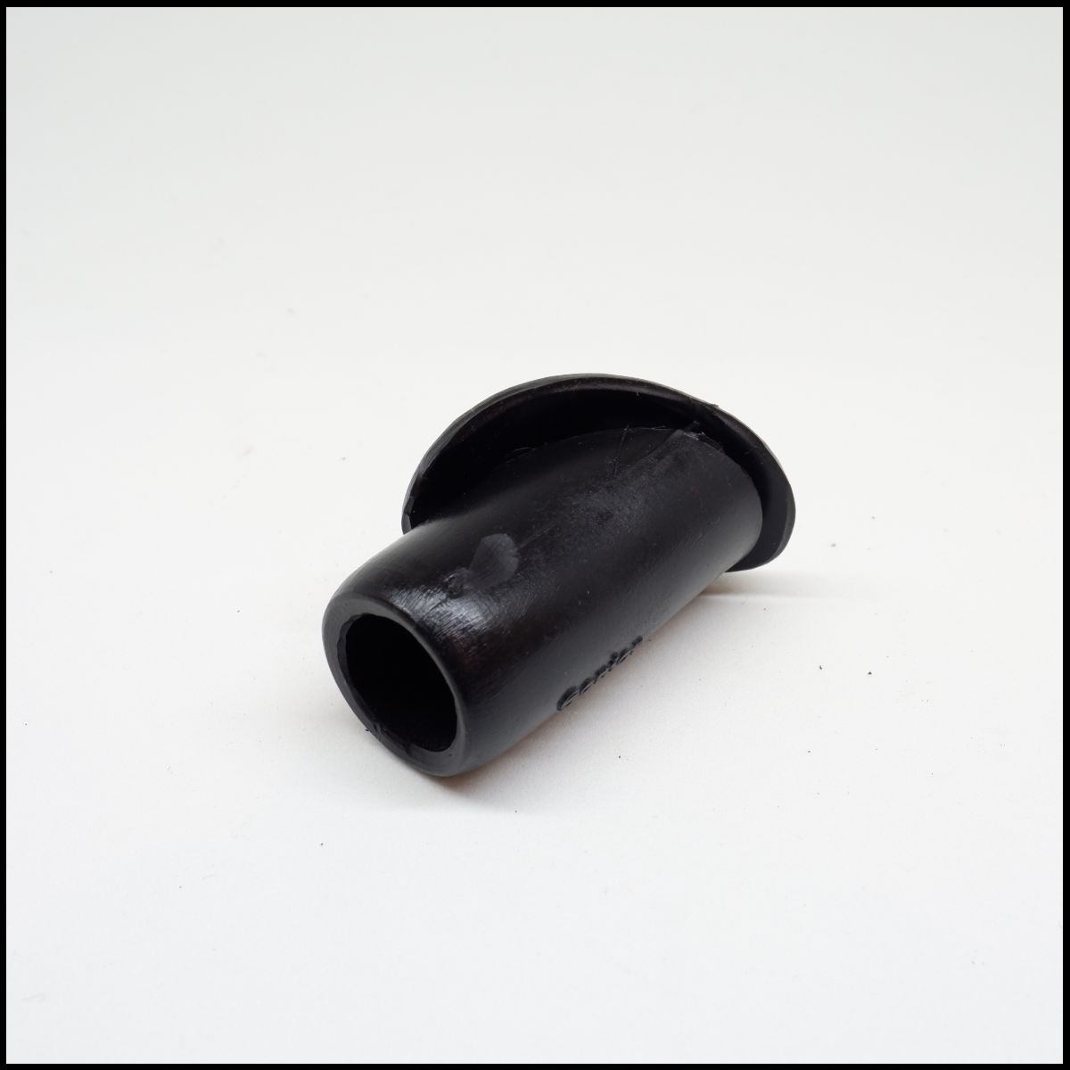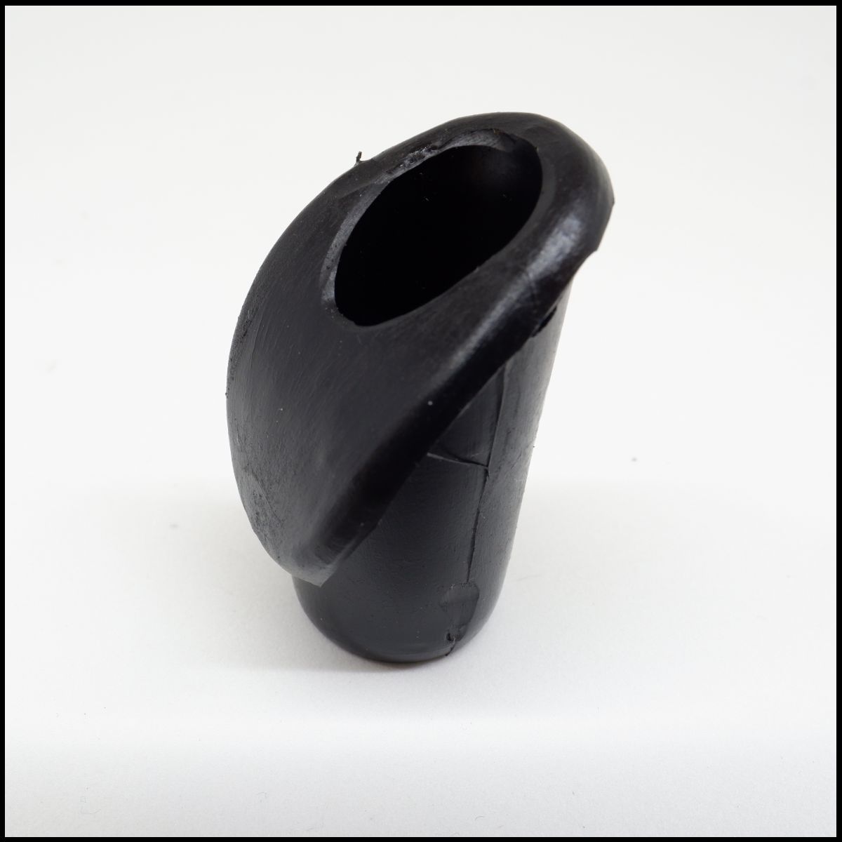Peça plástica preta cilíndrica com borda irregular em fundo branco