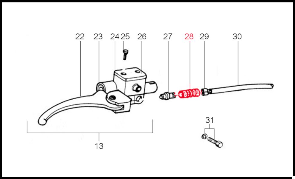 Desenho técnico em preto e branco de uma manete de travão com peças numeradas