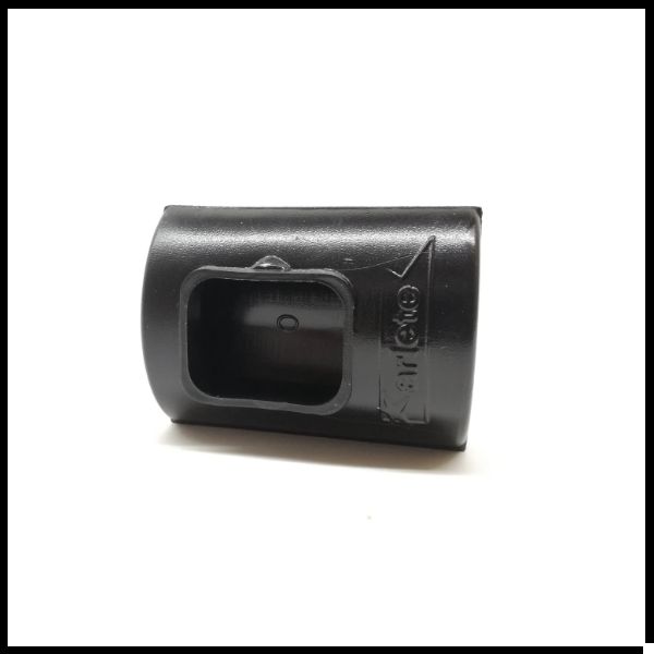 Peça plástica preta retangular com recorte e texto em relevo