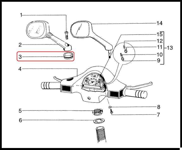 Diagrama técnico de espelhos retrovisores e painel de moto