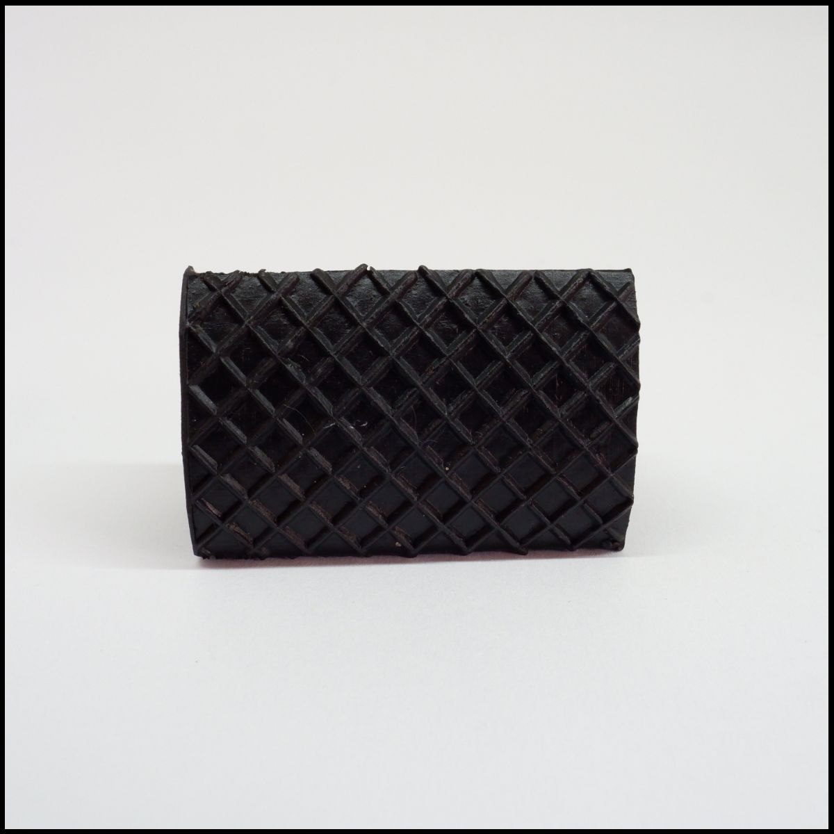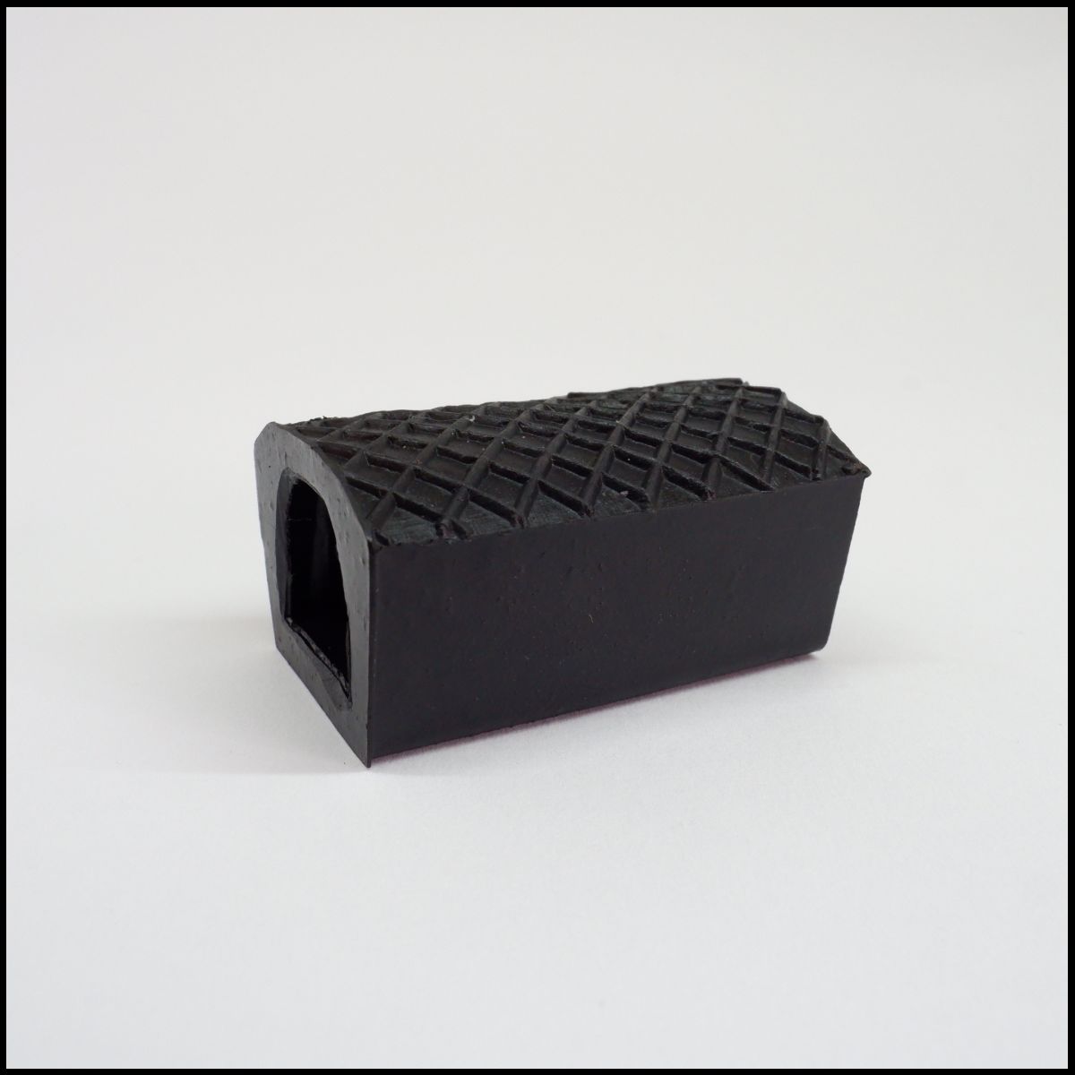 Peça de borracha preta retangular com padrão texturizado e buraco evidente