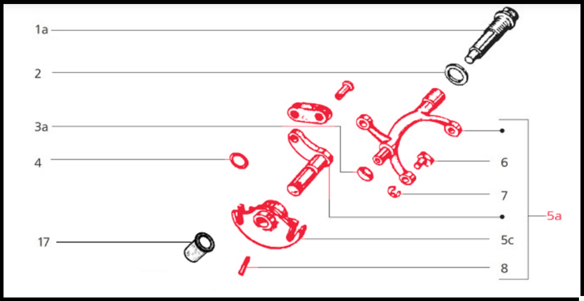 Diagrama técnico de peças mecânicas numeradas em preto, branco e vermelho.