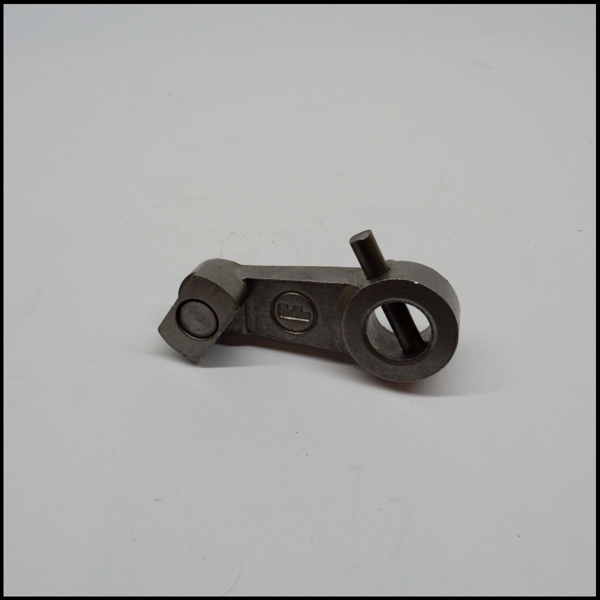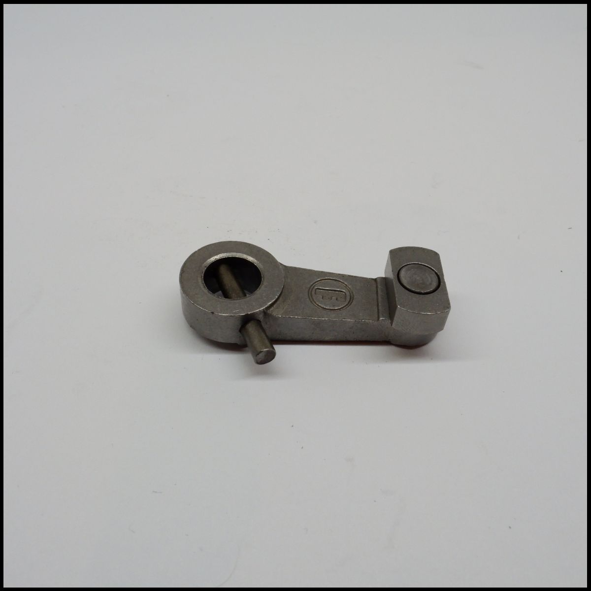 Peça metálica cinzenta com orifícios e pino sobre superfície branca