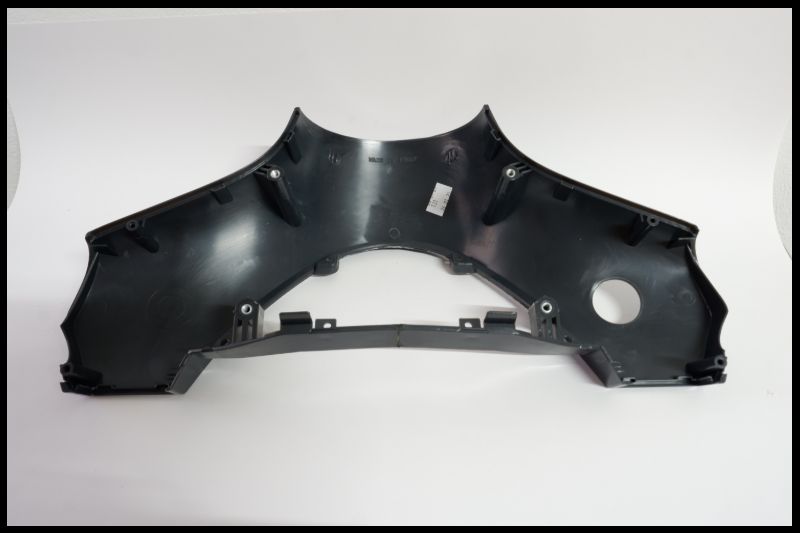 Peça plástica preta de automóvel com etiqueta branca sobre fundo branco