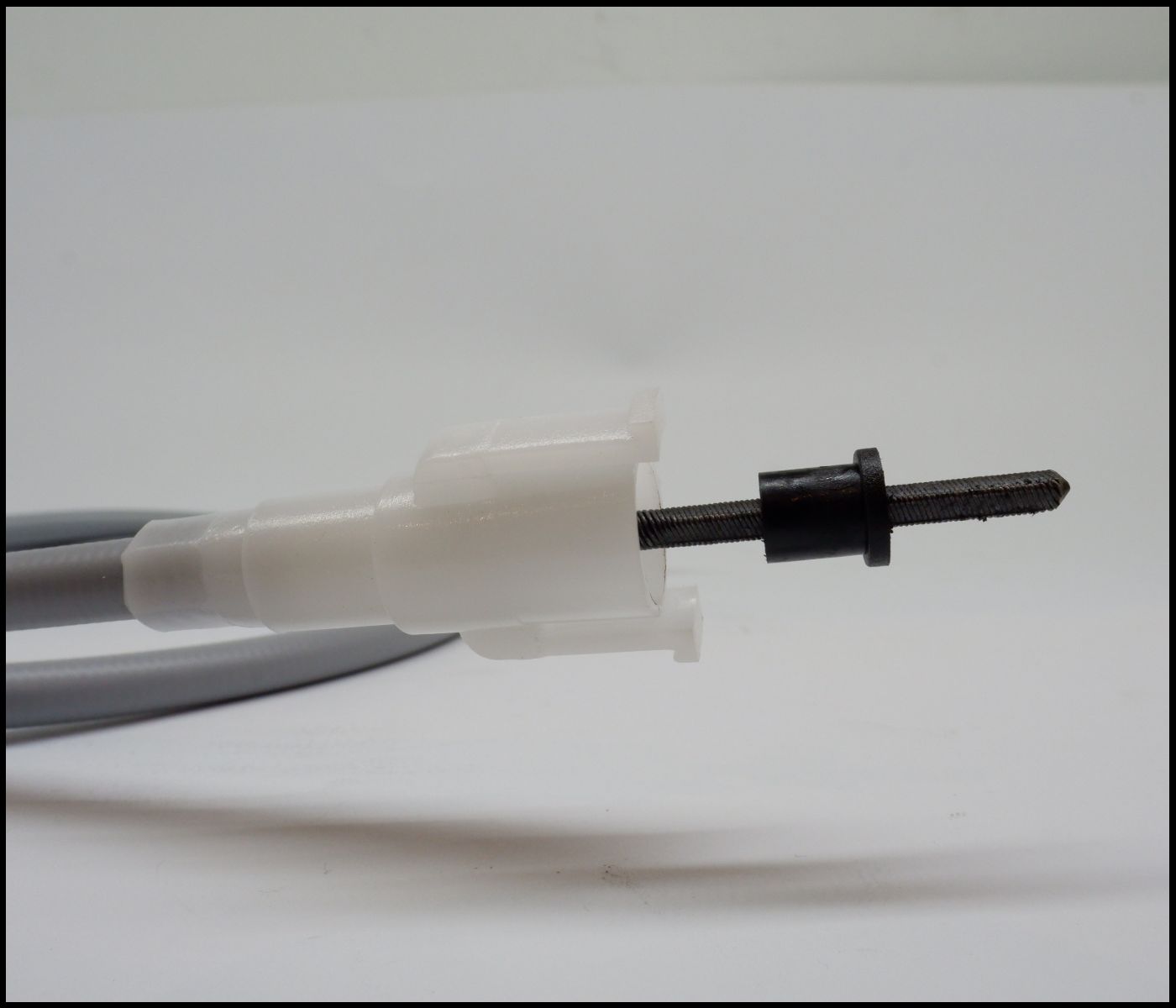Cabo cinzento com extremidade branca plástica e componente metálico preto e prateado com textura roscada