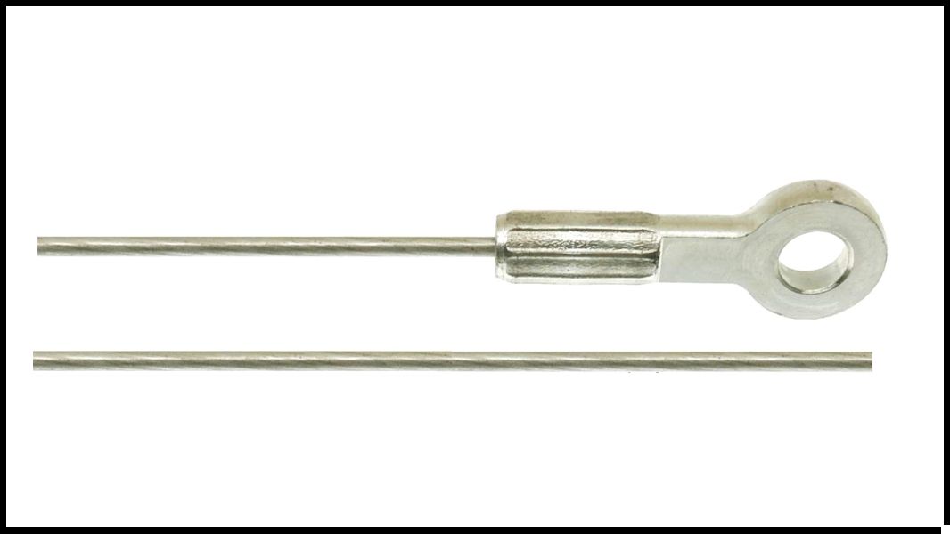 Dois arames metálicos prateados, um com orifício circular na extremidade tubular.