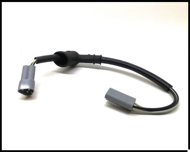 Cabo adaptador preto com conetores cinza numa superfície branca