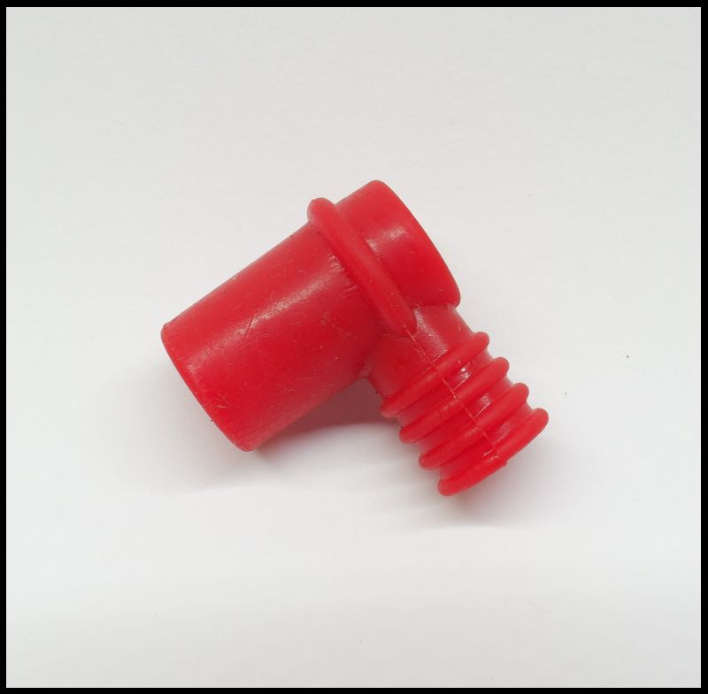 Peça plástica vermelha em ângulo reto com ranhuras, fundo branco