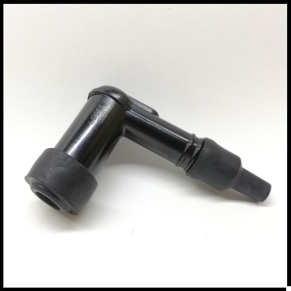 Capa resistora para vela de ignição preta sobre caixa amarela com texto