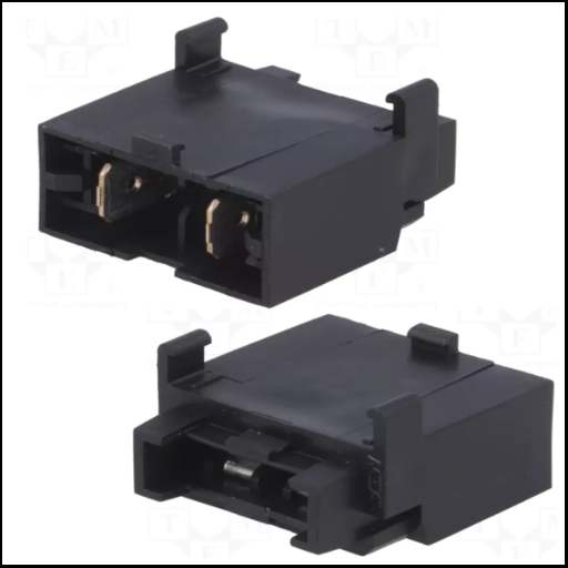 Conector elétrico preto com dois pinos metálicos em fundo branco