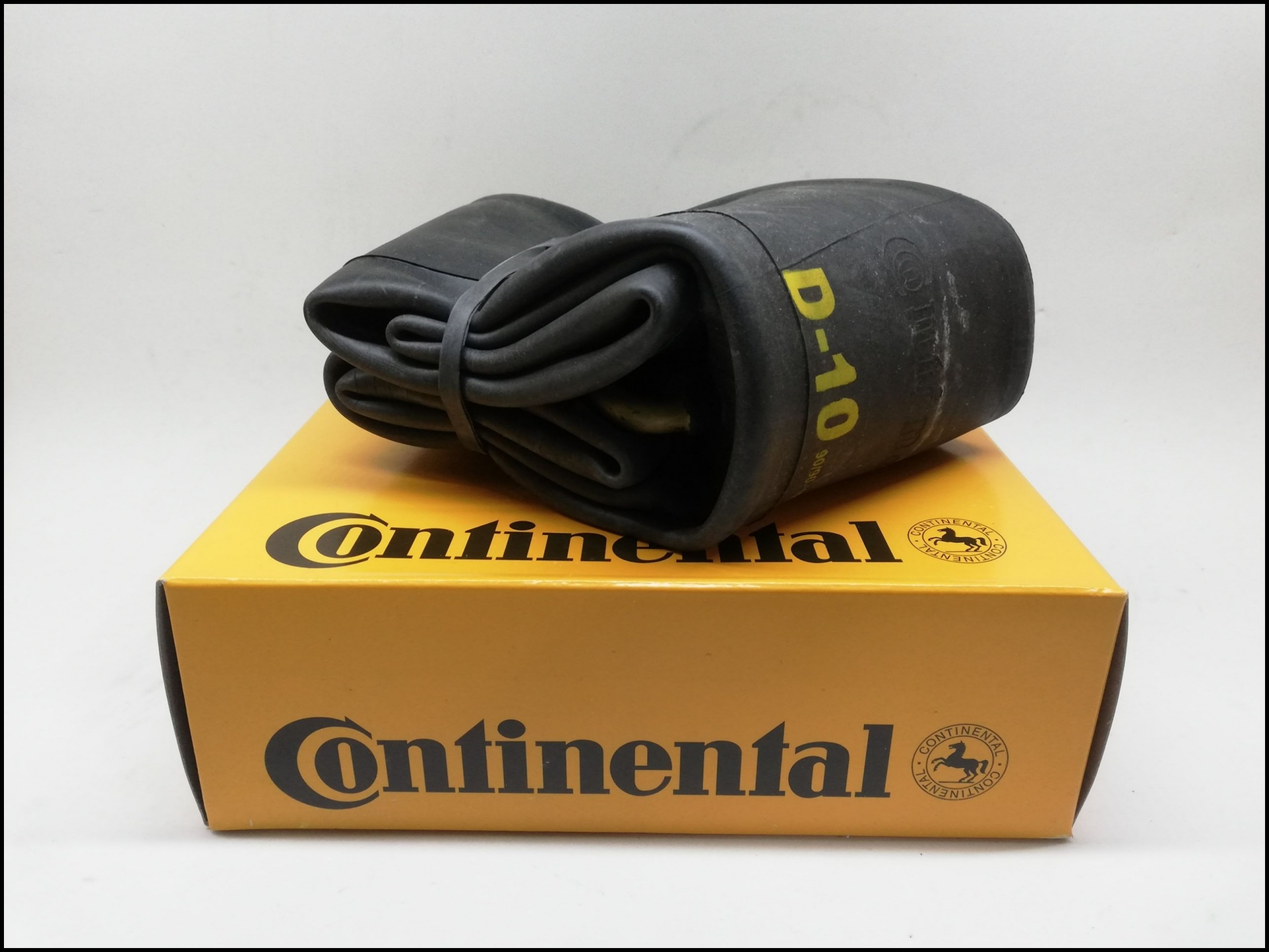 Camara de ar preta Continental D-10 sobre caixa amarela com logo Continental