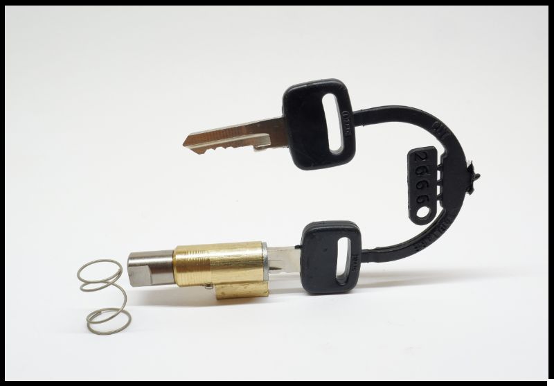 Fechadura cilíndrica dourada com chaves pretas e molas metálicas