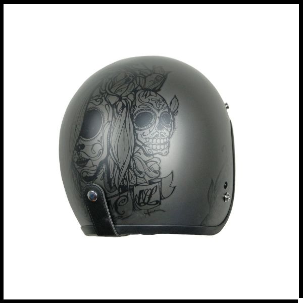 Capacete moto aberto cinza com desenho de caveira