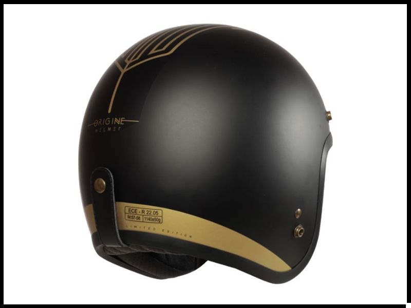 Capacete preto fosco com detalhes dourados e texto Origine Helmet