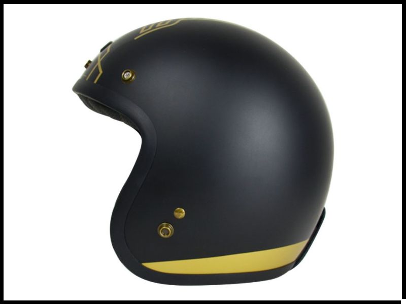 Capacete de moto preto mate com detalhes dourados e etiqueta