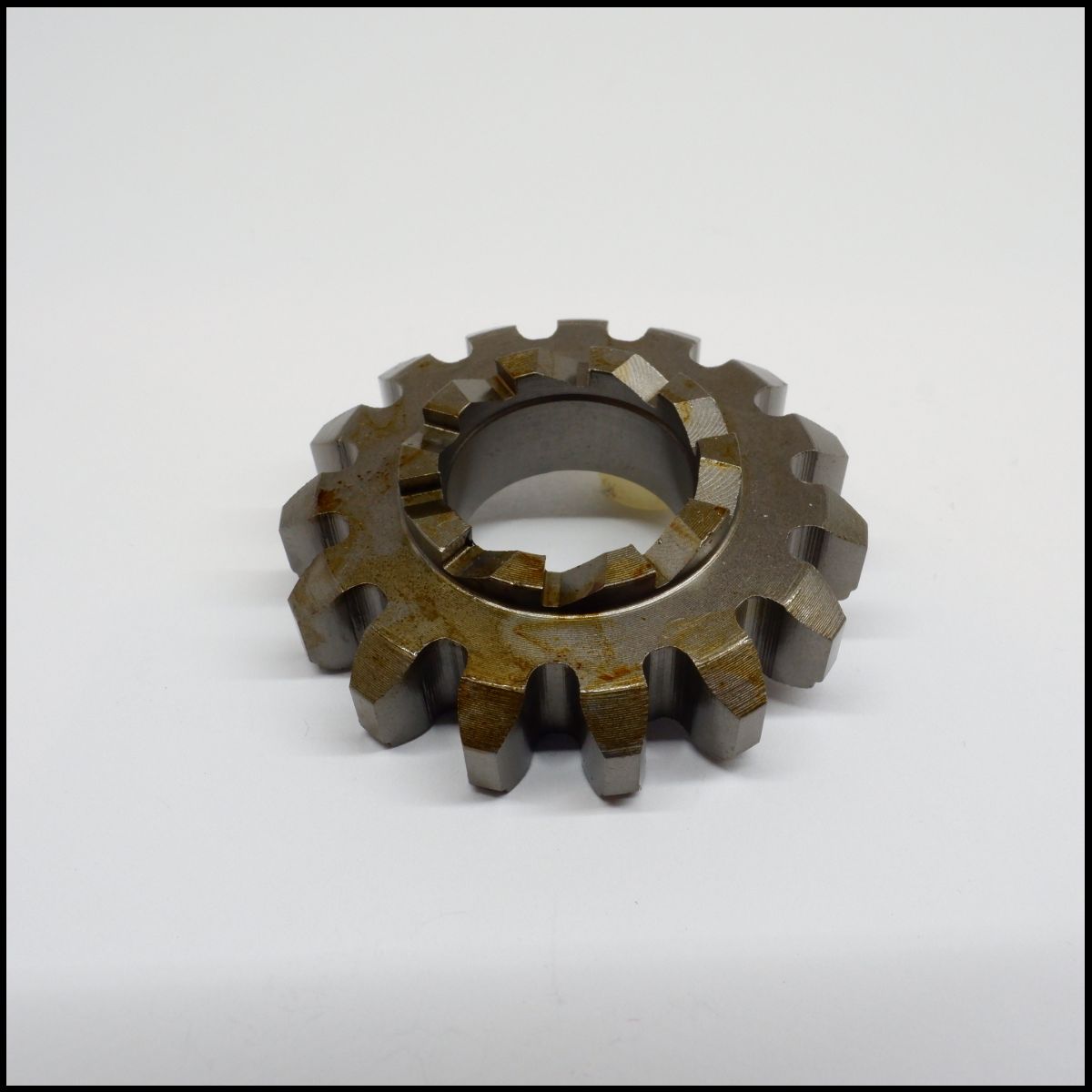 Engrenagem metálica cinza escuro com 13 dentes sobre fundo branco