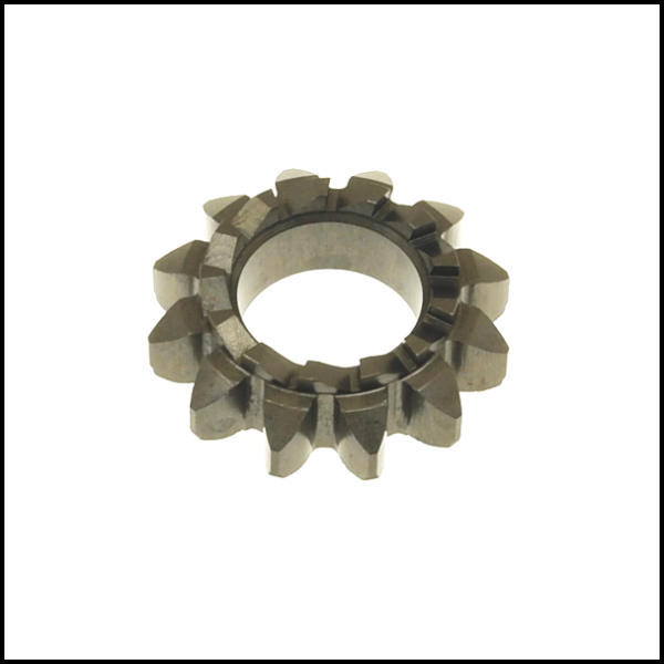 Engrenagem metálica de dentes inclinados sobre fundo branco