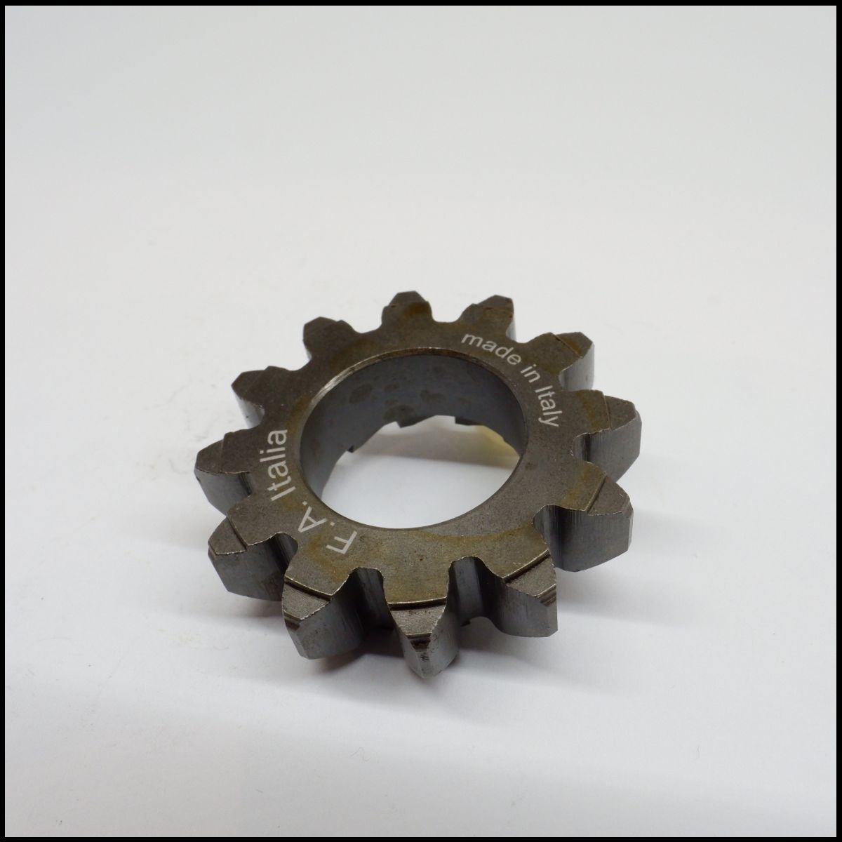 Engrenagem metálica cinza escuro com dentes largos sobre superfície branca