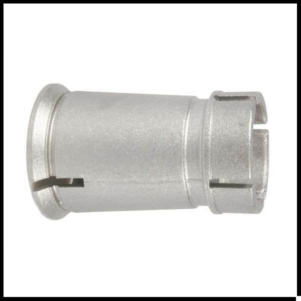 Peça metálica cilíndrica prateada com ranhuras em fundo branco
