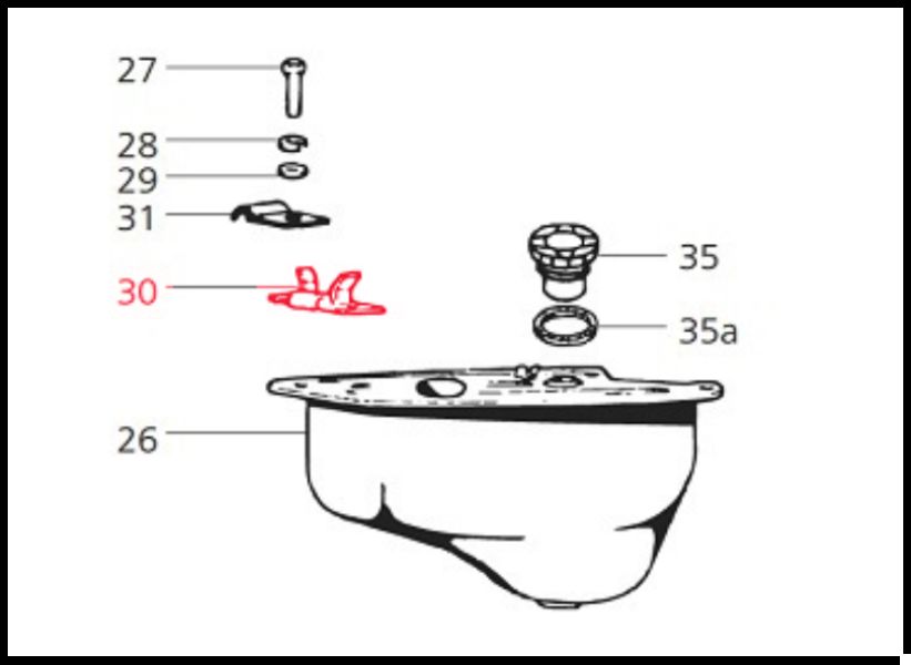 Desenho técnico de peças mecânicas numeradas com uma peça a vermelho.