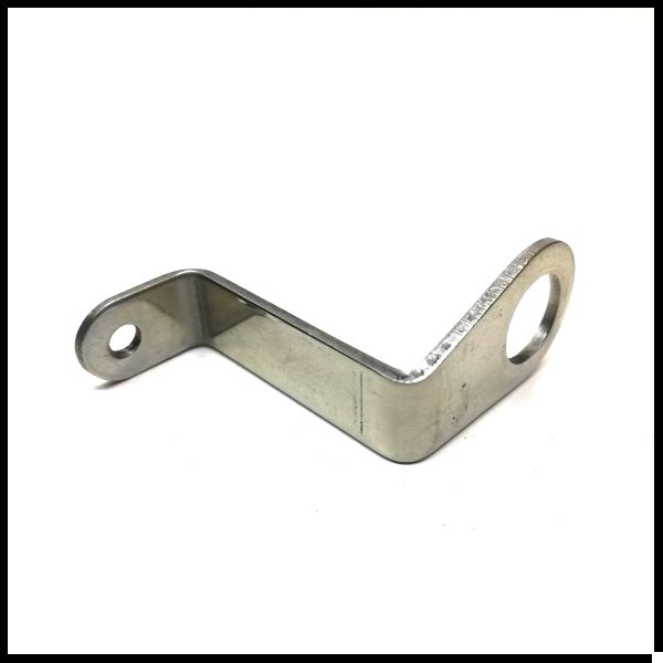 Peça metálica em forma de ângulo com orifícios circulares em cada extremidade