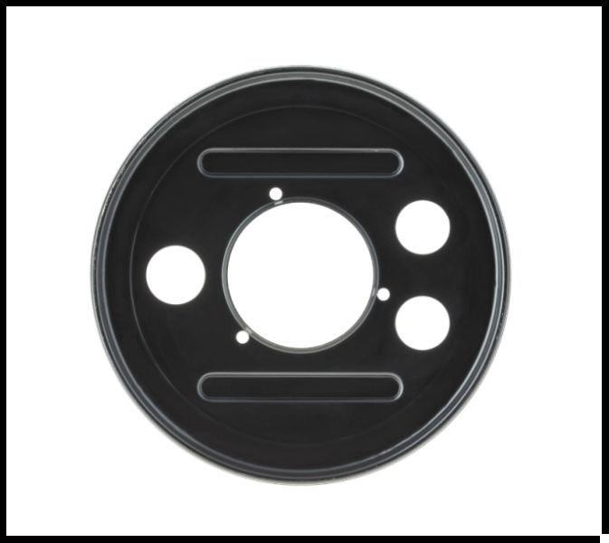 Peça metálica circular preta com vários furos