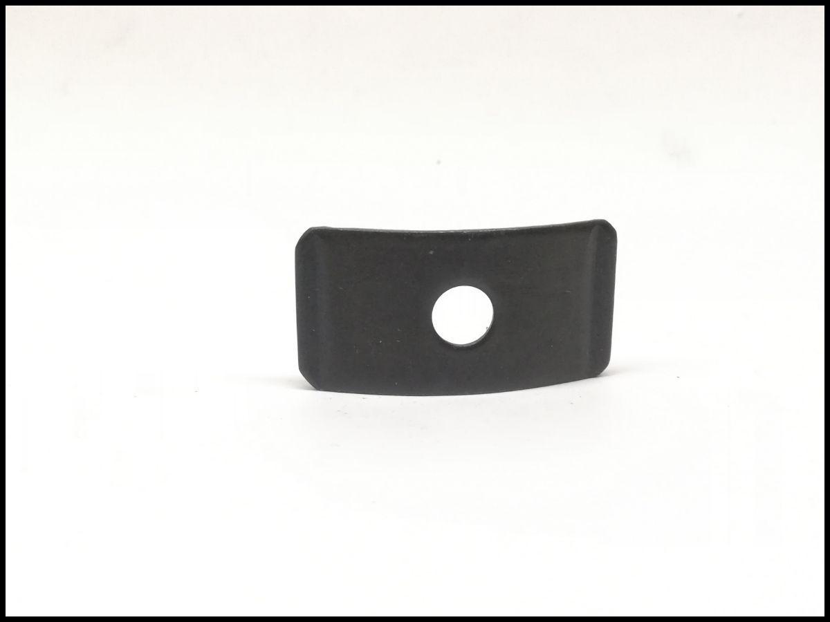 Peça metálica curva preta com orifício central sobre fundo branco
