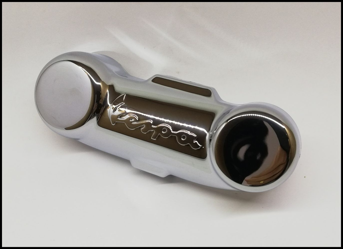 Peça metálica cromada brilhante com inscrição Vespa