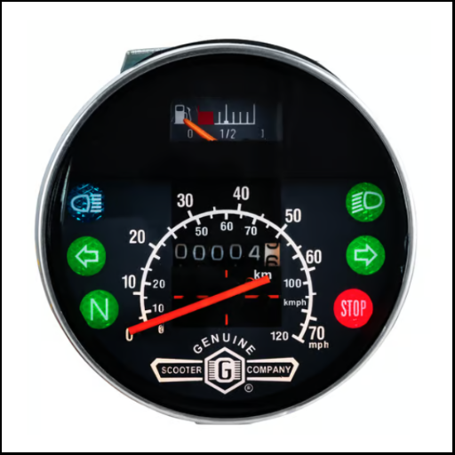 Velocímetro redondo preto com indicadores e logótipo de scooter