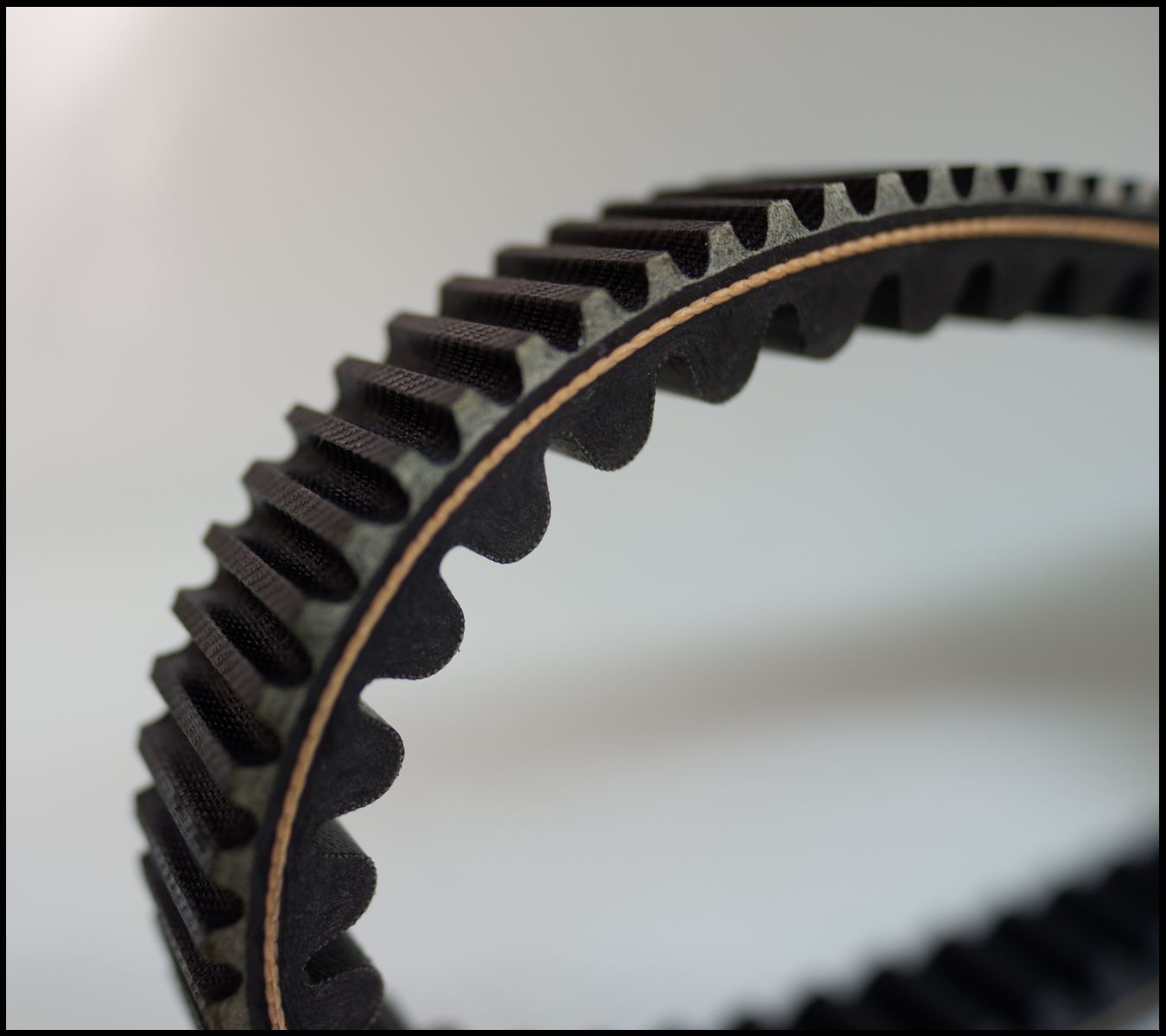 Correia dentada preta de borracha com textura rugosa e camada castanha interior