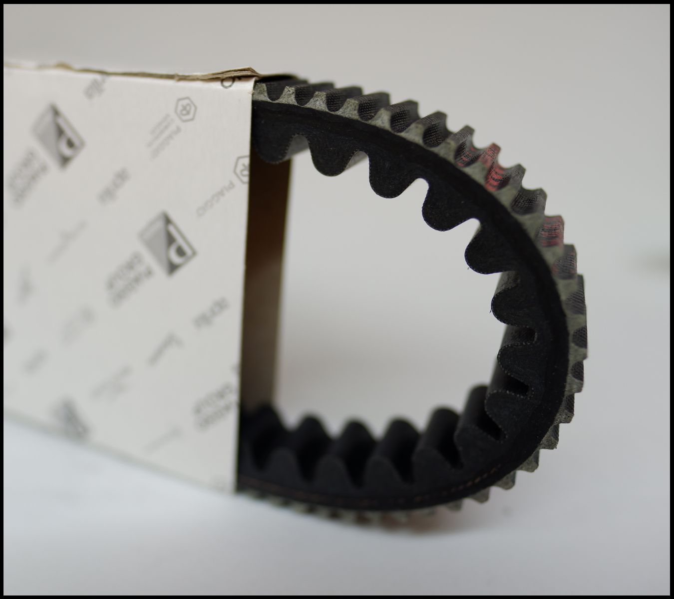 Correia dentada preta parcialmente dentro de caixa branca com padrões de logótipos