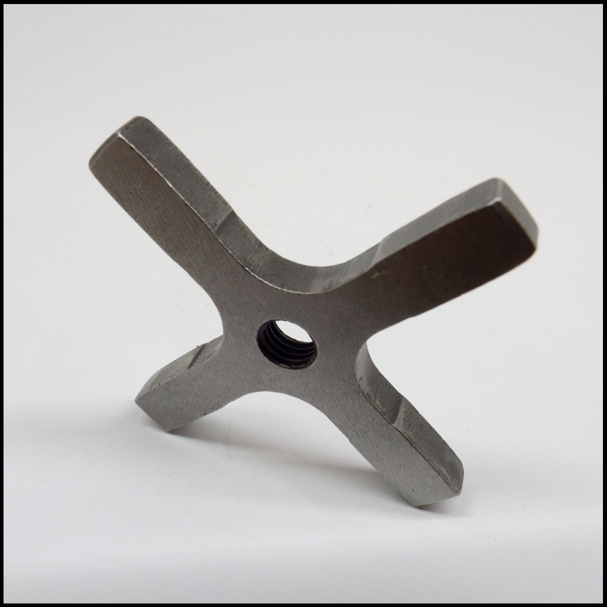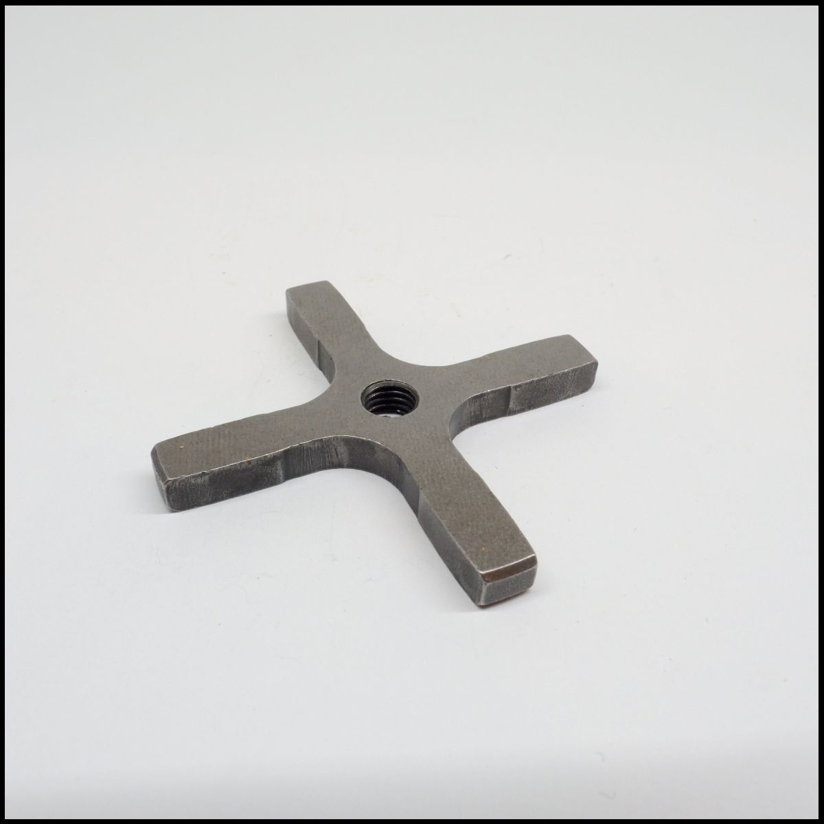 Peça metálica cinza escuro em forma de cruz com rosca interna no centro