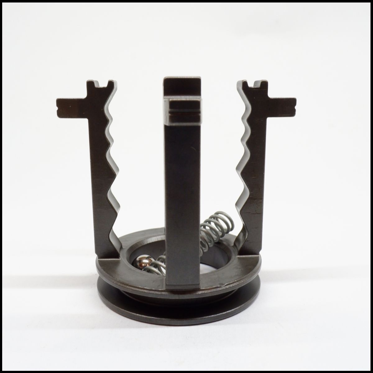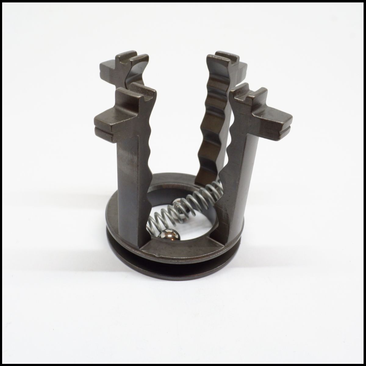 Estrutura metálica cinza com mola helicoidal e esfera no centro, sobre fundo branco