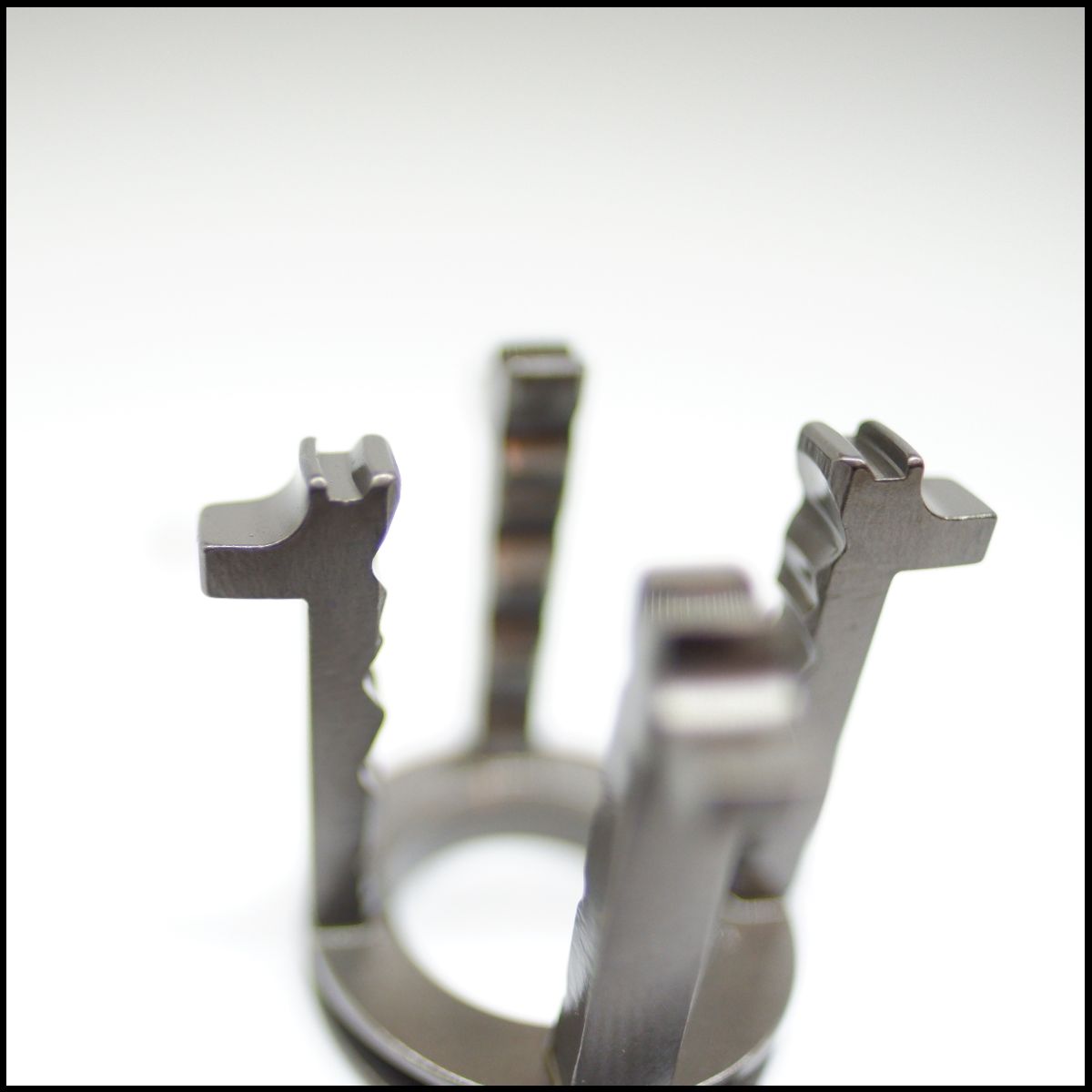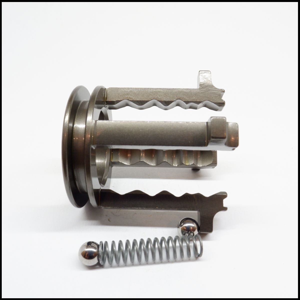 Peça metálica cinzenta com mola helicoidal e apoios verticais em fundo branco